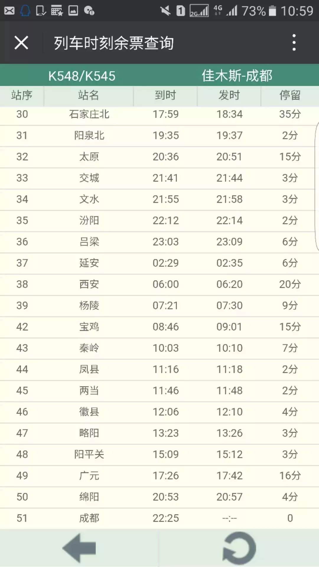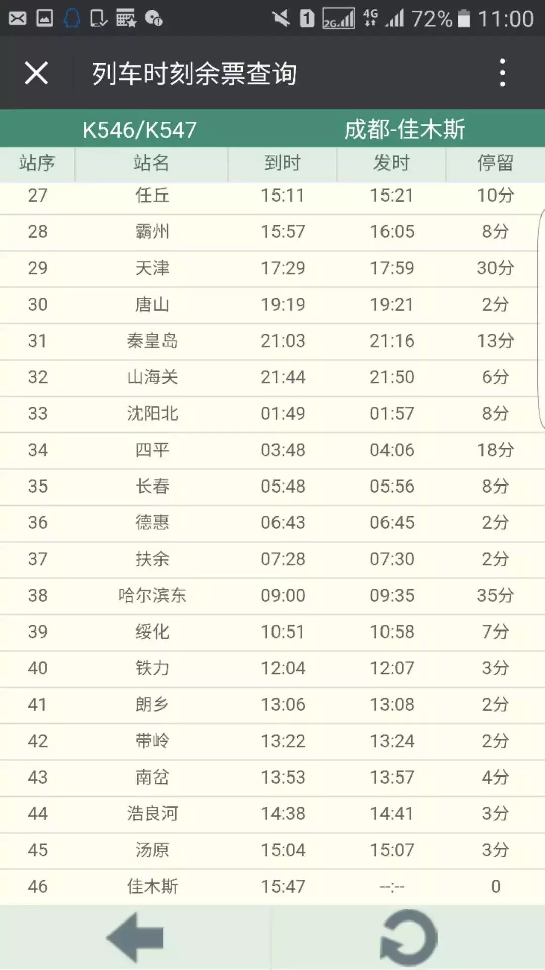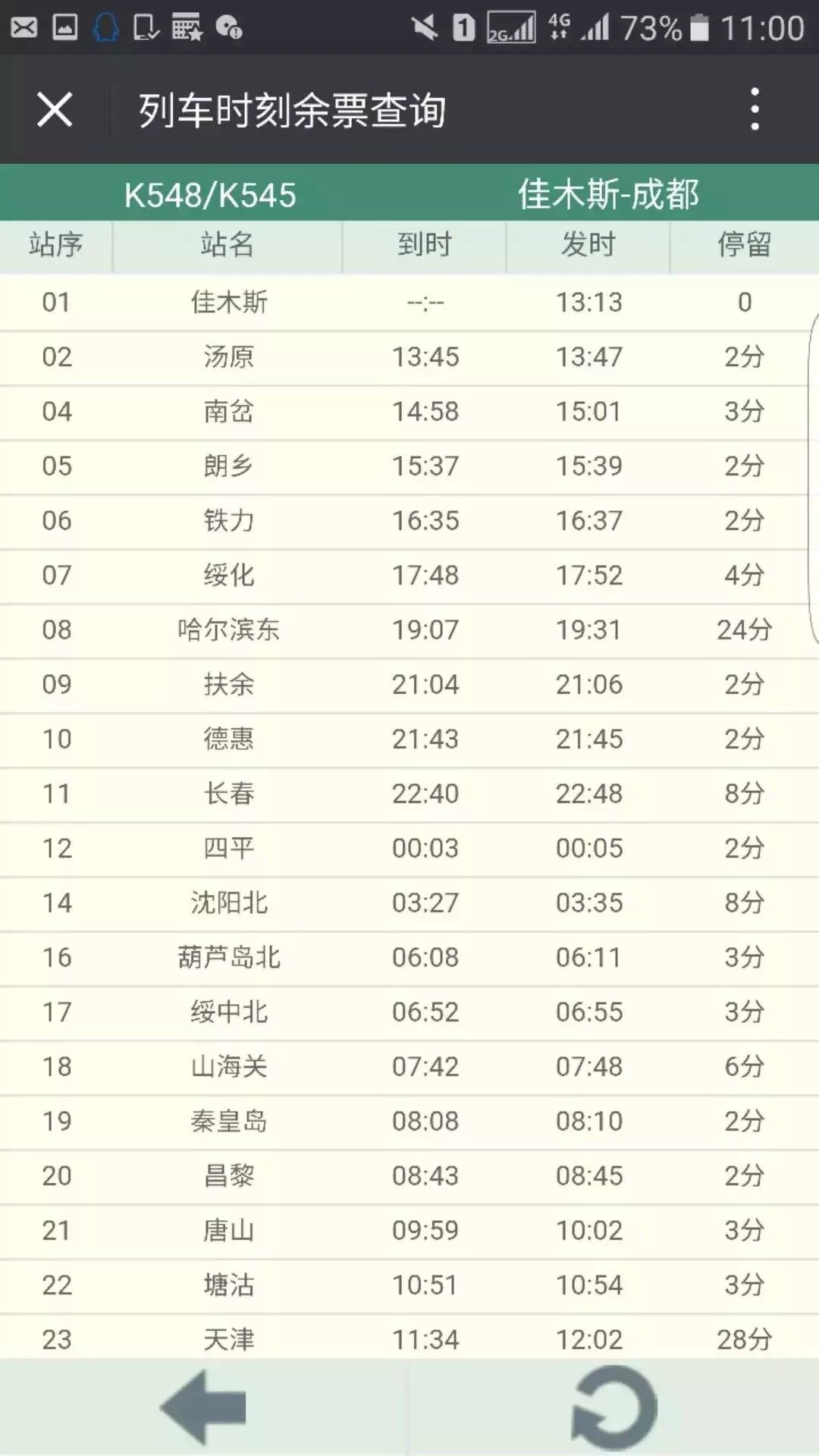 12306网站显示,列车恢复后,K548次列车13时13分从佳木斯站发车,19时07分到达哈尔滨东站,次日22时25分到达成都;K546次7时37分从成都站发车,第二天9时到哈尔滨东,15时47分到达佳木斯站。