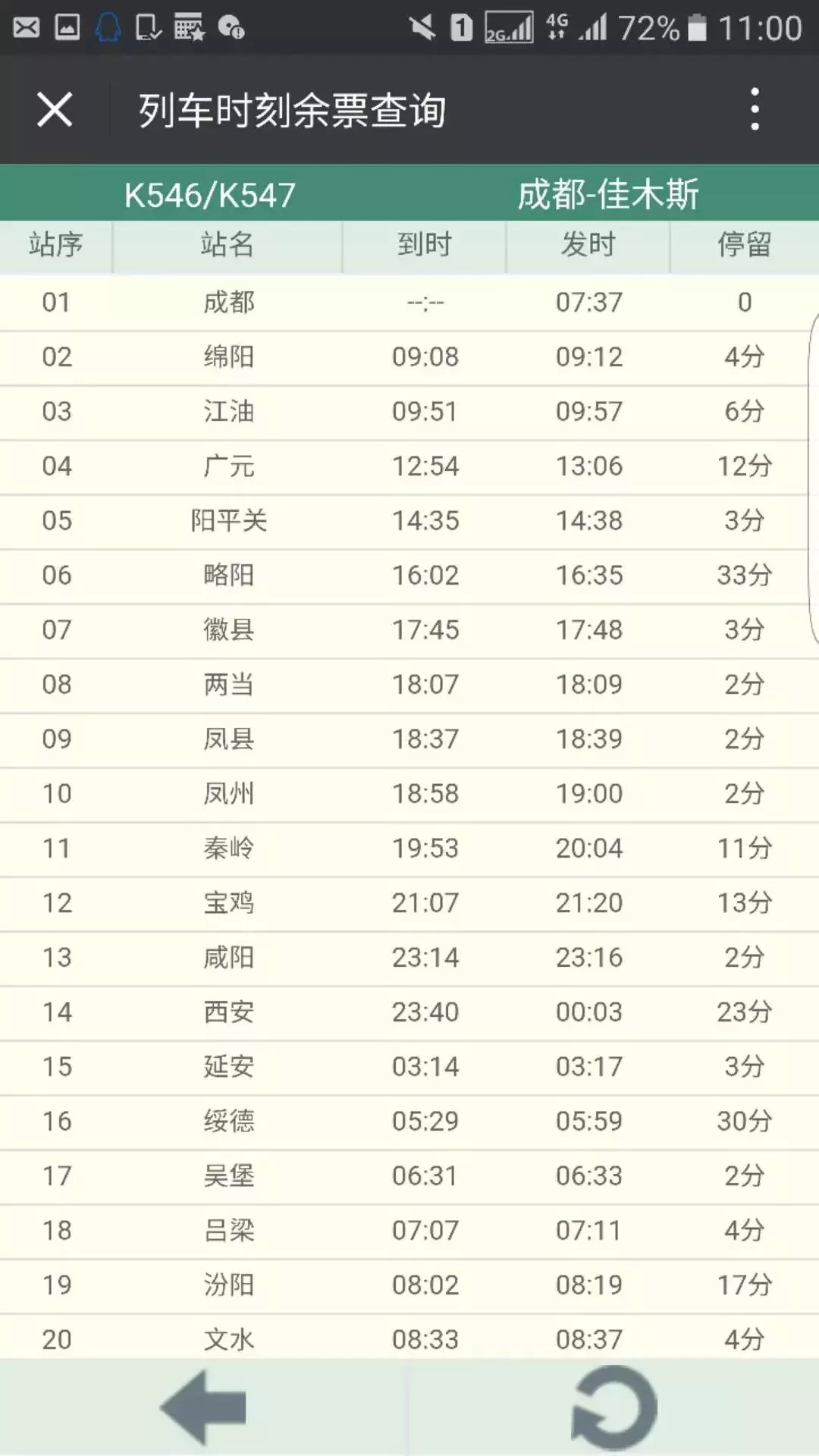 记者查询12306网站得知,受宝成线水害影响停运的佳木斯至成都K548次列车将于20日恢复,返程的K546次列车将于23日恢复。