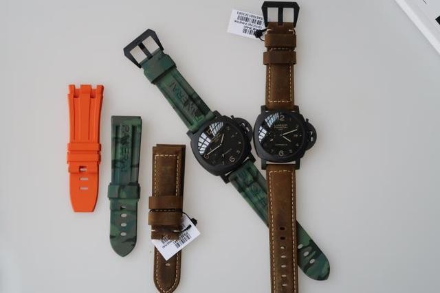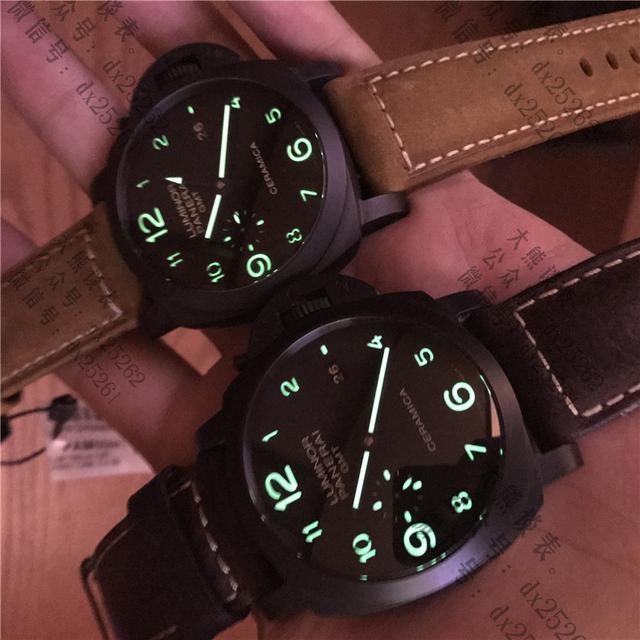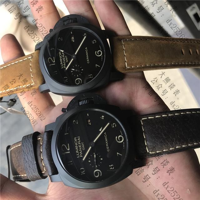 总结:44mm的沛纳海,不算很大,符合大部分男性手腕,黑色陶瓷配上棕色风马皮表带,十分的潮流时尚,字面阿拉伯数字看时间很方便,另外超强夜光在夜里也是十分清晰。而且沛纳海的表带也可以自己随意搭配,先来看看大熊搭配的效果。还有很多五颜六色的给你的夏日带来更多的精彩!