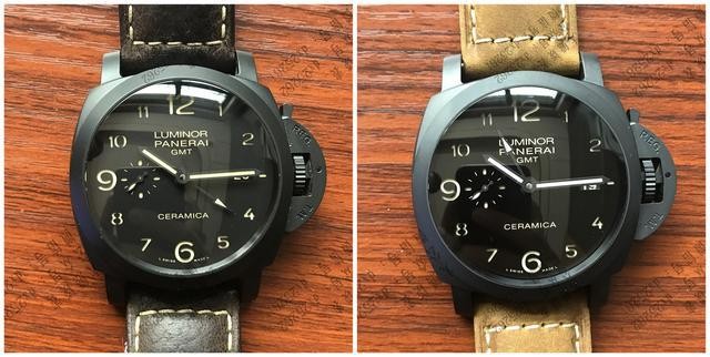 正面对比:首先看下整体的对比,稍后再进行细节比对,图中正品的深棕色表带也不是原装的,而VS配备的是跟正品一个颜色的深棕色风马皮表带,同样的陶瓷外圈,但是我总感觉正正品的陶瓷外圈很亮,而VS的陶瓷外圈相对于正品来说是黯淡了些许!在这里要提醒表友陶瓷外圈的缺点就是易碎,日常佩戴要小心注意,待会会说陶瓷外圈的优点!