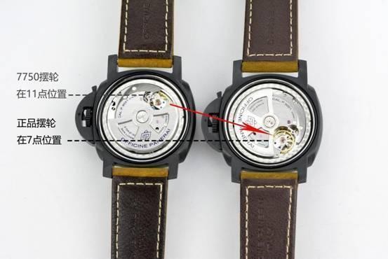 重点来了机芯方面:这是大熊认为是最优意义的修改,我也会着重介绍,之前很多厂家都生产过沛纳海441,像是KW,ZF,他们都是采用7750机芯修改P9001机芯,缺点是:第 一机芯不稳定,第二就是背透一眼假,十沛九假并,非空穴来风。我这里刚好有7750对比正品的图片大家看看是不是一样假!
