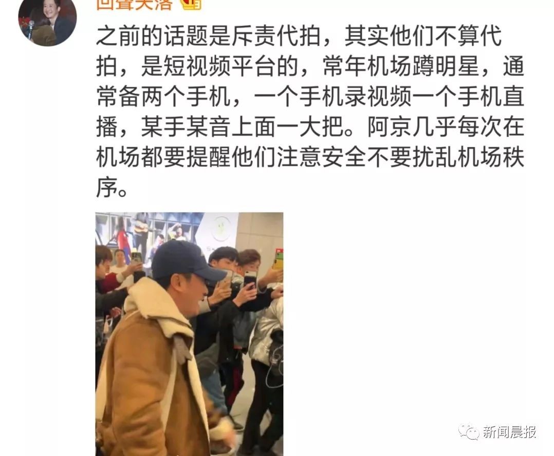 还有网友表示这些人不算代拍,是短视频平台的,常年机场蹲明星,通常备两个手机,一个手机录视频一个手机直播,在某软件上面一大把。吴京几乎每次在机场都要提醒他们注意安全,不要扰乱机场秩序。