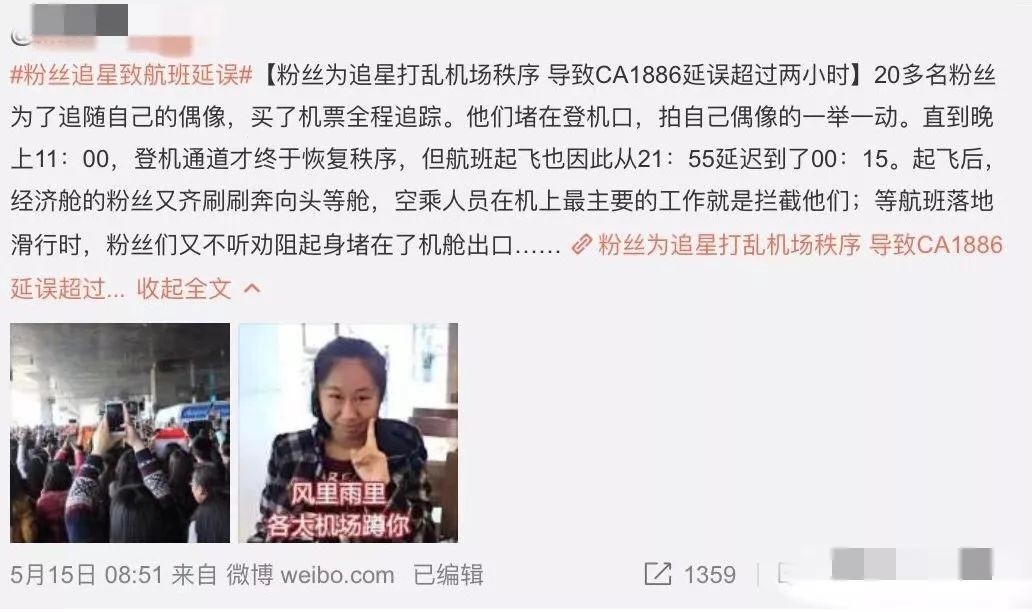 而短短不到三天,5月10日,从北京首都机场出发的国航CA1549次航班,又因粉丝干扰迟迟无法起飞……