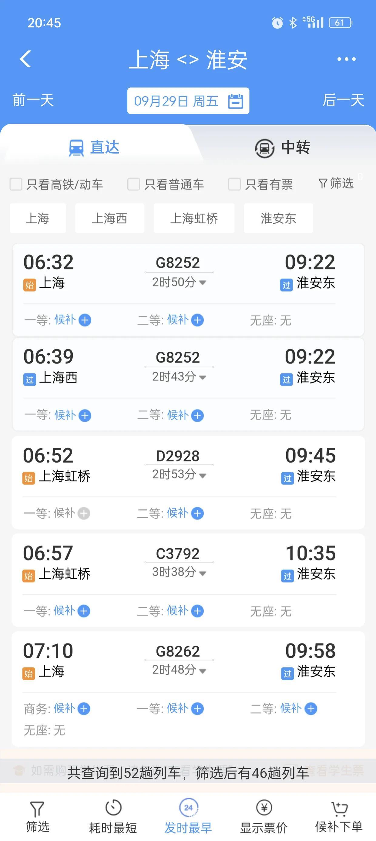 上海到淮安也是46趟,但是和扬州不一样的是上海是通过盐通、连镇两条铁路到达淮安,都是高铁。