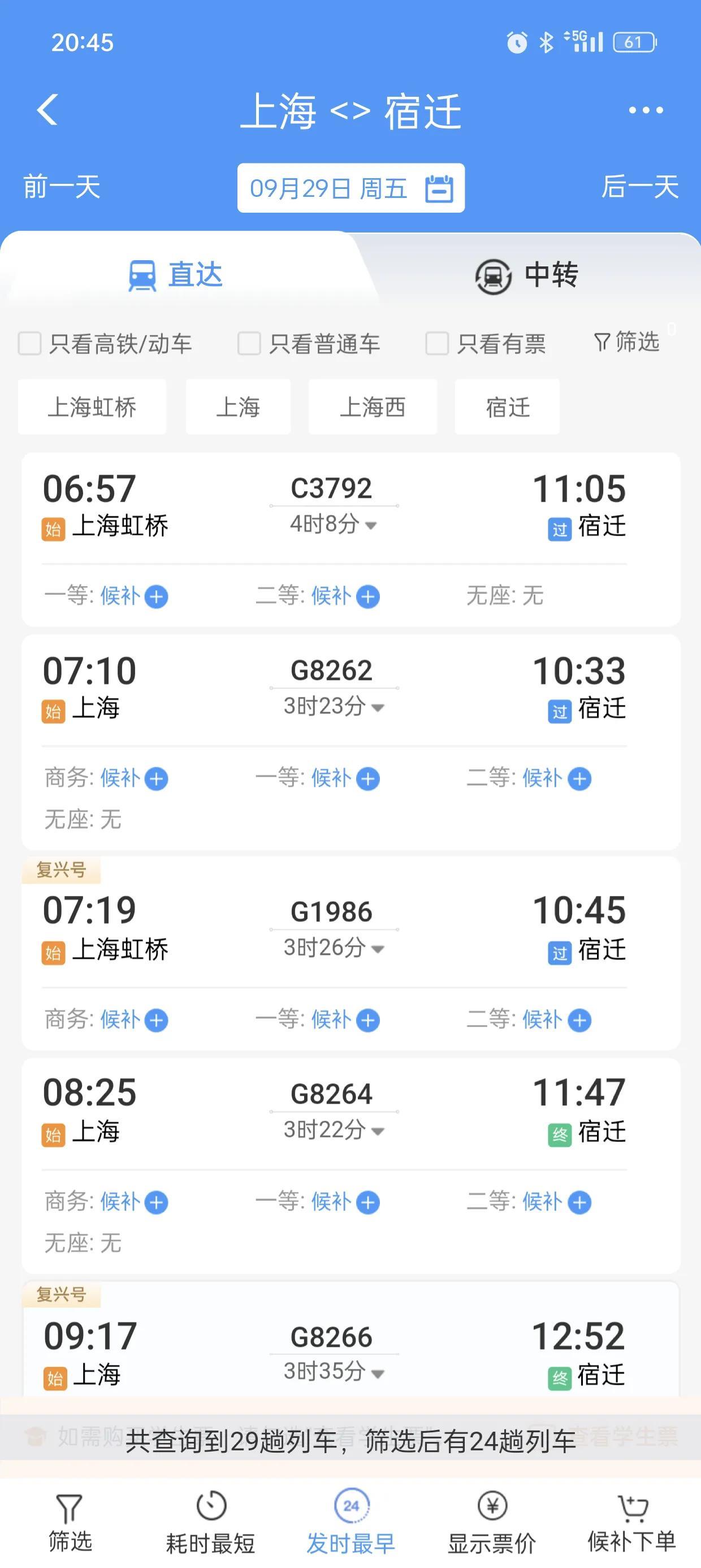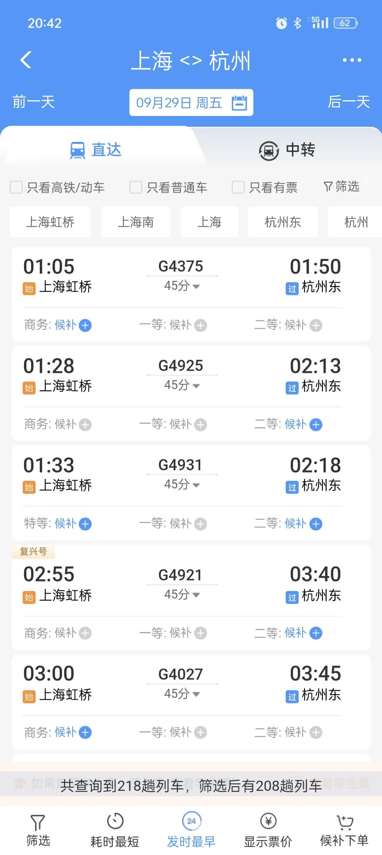 首先看一下上海到杭州的,作为一个参照,29号当天共有208趟火车高铁。