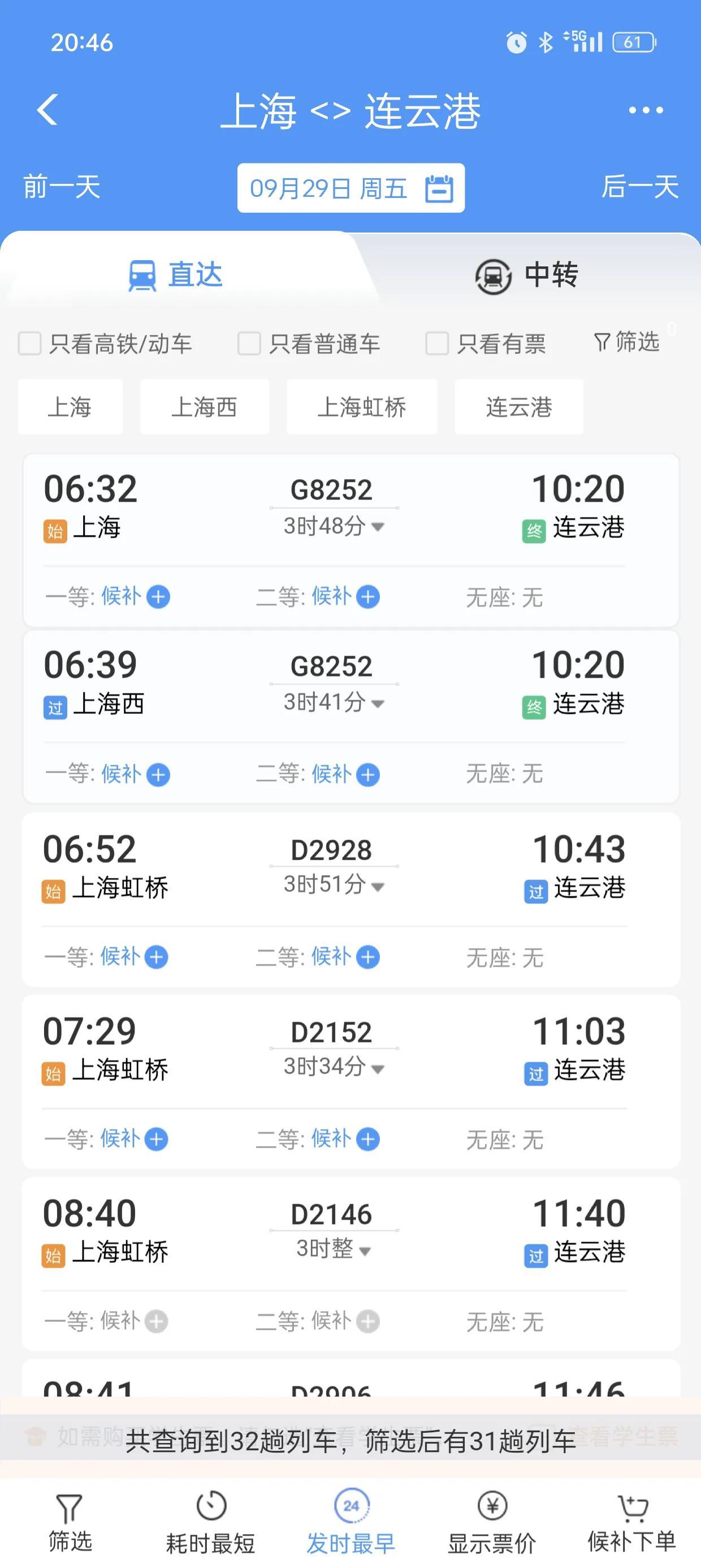 连云港作为连镇铁路、连通铁路的起点,上海的班次却不多。