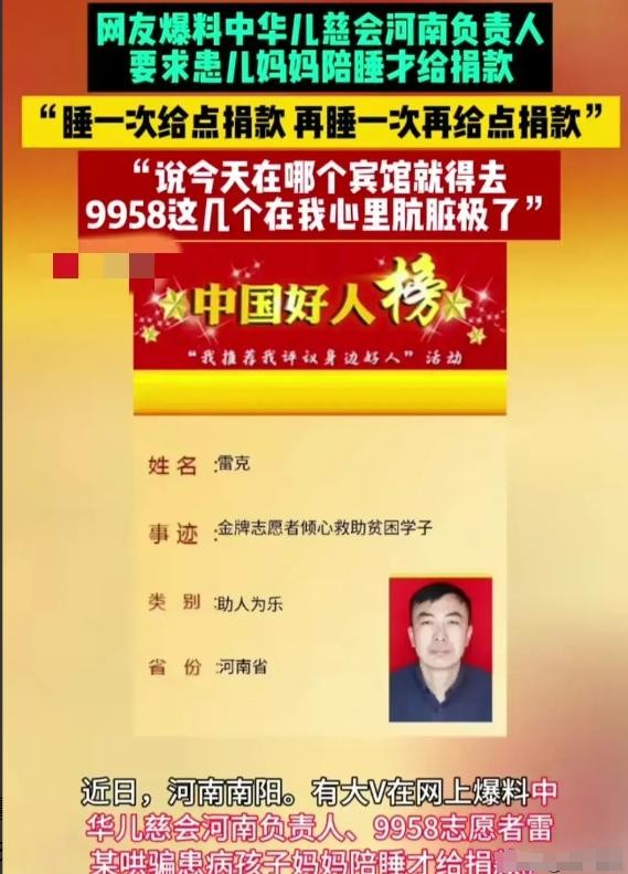 近日,一起震惊社会的慈善丑闻在河南曝光,将中华儿慈会及其河南负责人雷某推向了舆论的风口浪尖。据患儿母亲揭露,雷某作为9958志愿者及慈善机构的代表,在得知其孩子患病急需救助后,非但没有及时伸出援手,反而提出了令人发指的要求——以患儿母亲陪睡作为提供捐款的交换条件。这一行为不仅违背了慈善事业的初衷,更是对人性与道德的极大践踏。
