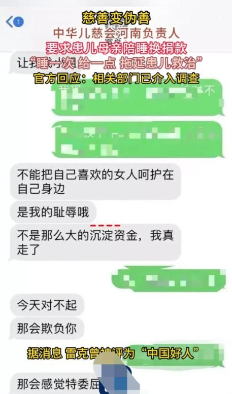 随着事件的持续发酵,双方交涉的聊天记录被逐一曝光,内容之恶劣、行径之无耻令人瞠目结舌。在聊天记录中,雷某不仅明目张胆地提出陪睡要求,还以拖延捐款、威胁患儿生命安全为手段,对患儿母亲进行精神压迫。这些记录无疑成为了雷某恶行的铁证,也让公众对慈善机构的信任度降至冰点。