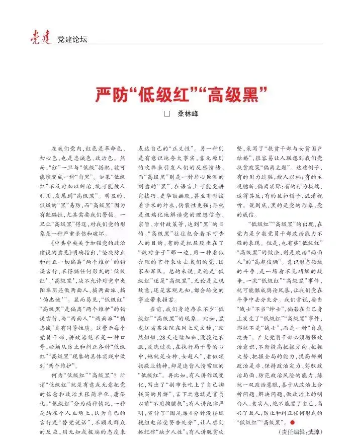 日前,《党建》杂志刊发《严防“低级红”“高级黑”》一文。该文列举了4个典型案例,明确了实际工作中“低级红”“高级黑”是怎样的。
