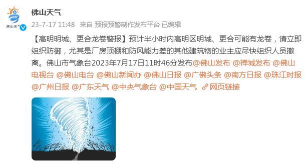 佛山气象台紧急提醒:17到18日佛山有发生龙卷风的风险……