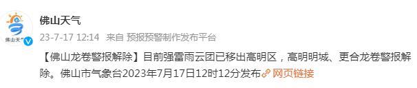 随后佛山气象台发布龙卷解除警报