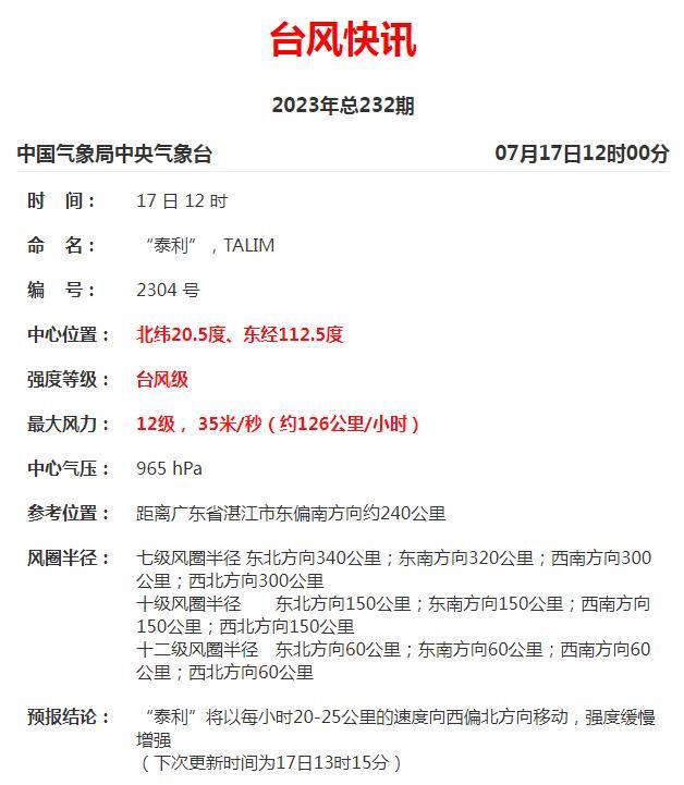 17日12时,今年第4号台风"泰利"(台风级)中心位于北纬20点5度,东经112点5度,距离湛江东偏南方向约240公里的南海西北部海面上,中心附近最大风力12级,达到35米每秒的风速,中心最低气压965百帕,八级大风半径约250公里。