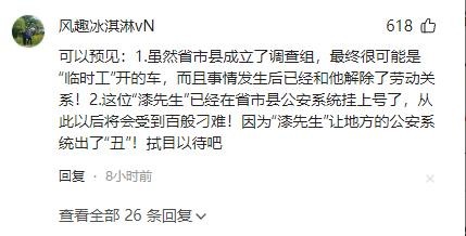 可以预见:1.虽然省市县成立了调查组,最终很可能是“临时工”开的车,而且事情发生后已经和他解除了劳动关系!2.这位“漆先生”已经在省市县公安系统挂上号了,从此以后将会受到百般刁难!因为“漆先生”让地方的公安系统出了“丑”!拭目以待吧