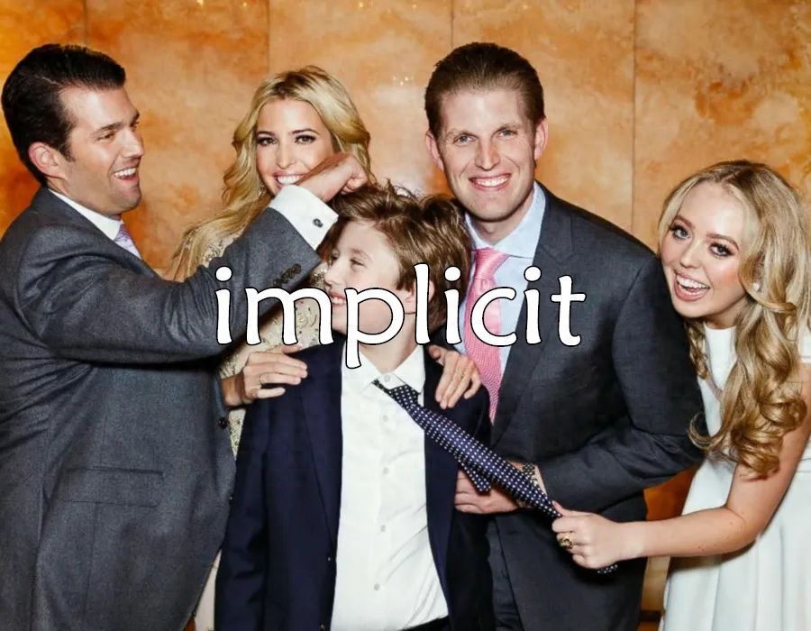 A very near synonym of implicit in this particular meaning is the word implied. But the adjective implicit also means "complete without any doubt," so we can say that we have implicit trust or confidence in someone. The Latin root implicāre means "to involve or entangle." Another English word with a more obvious connection to the Latin is the verb implicate.