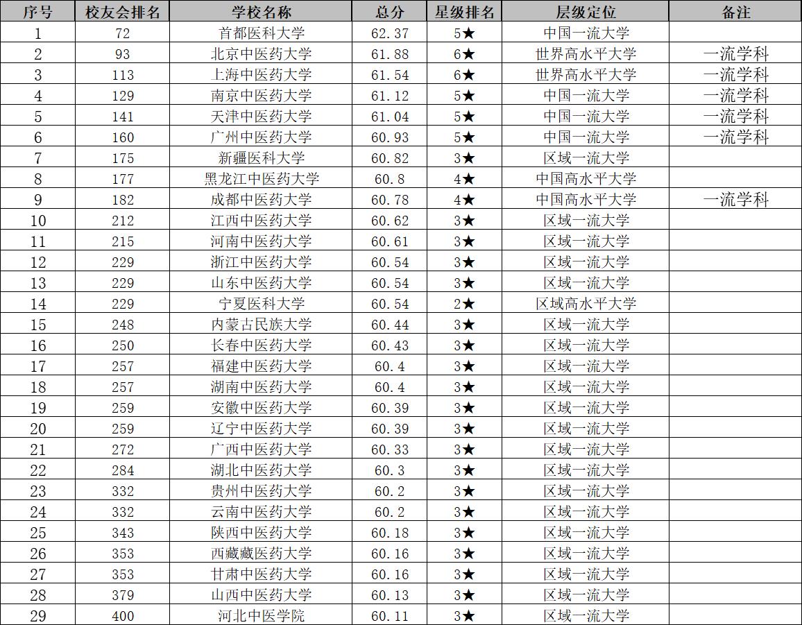 榜单上共29所中医药本科院校,作为曾经中医药大学中唯一的211工程大学,北京中医药大学高居榜首,综合实力位列高校综合排名93。