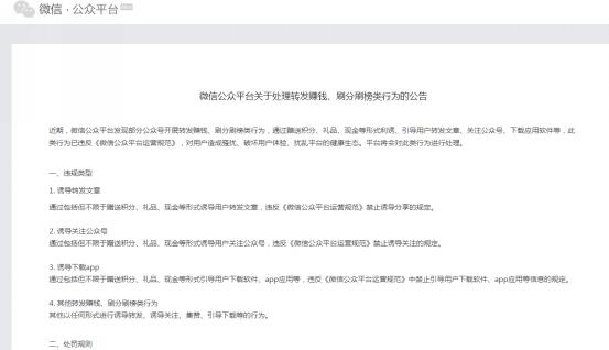 “2016年3月10日,微信公告称,将对“转发赚钱、刷分刷榜类”的诱导行为进行处罚,处罚形式包括删文、限制帐号部分能力或封禁帐号等。”