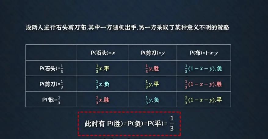 有些观众可能会说那石头剪刀布是个随机游戏。有什么策略呢?理论上讲,只要有任何一方绝对随机的出手,那胜利一定是五五开的。但遗憾的是,人无法随机,人的一切想法都源自于内心的主观思考,所以人只能随心,却永远无法随机。
