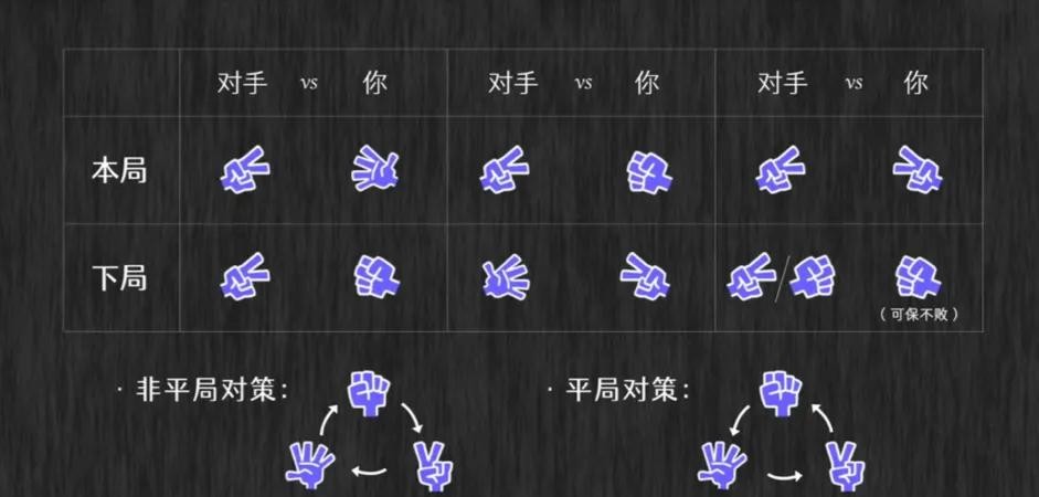 如果这局你赢了或者输了,你下局就出被制局克制的手势,也就是按石头、剪刀、布的顺序往下出。如果平局,你就反过来出克制这局的手势,也就是按石头、布、剪刀的顺序出。